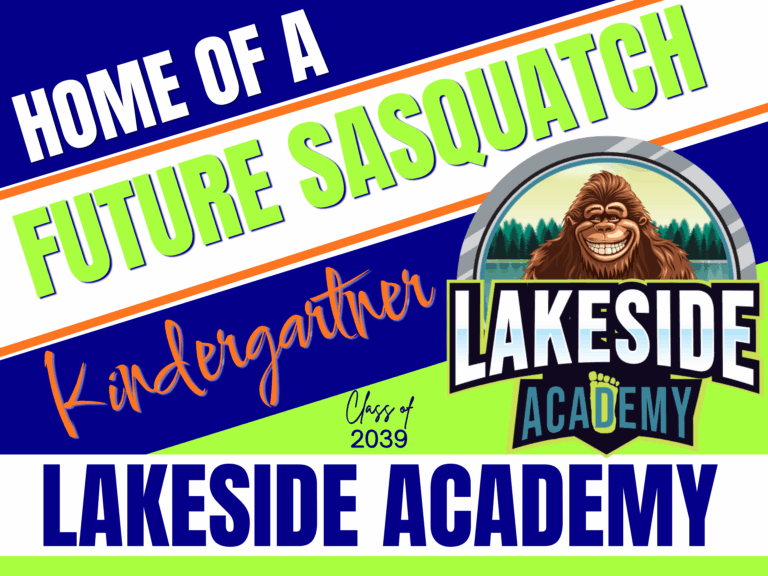 Welcome to Kindergarten! Welcome to the Lakeside Academy Family! We are so excited to have you as part of our new Lakeside Academy family!Show your school spirit with a “Home of a FUTURE Sasquatch” yard sign — the perfect way to celebrate your student and support the school!Celebrate, represent, and support — all at once 💙ORDER HERE